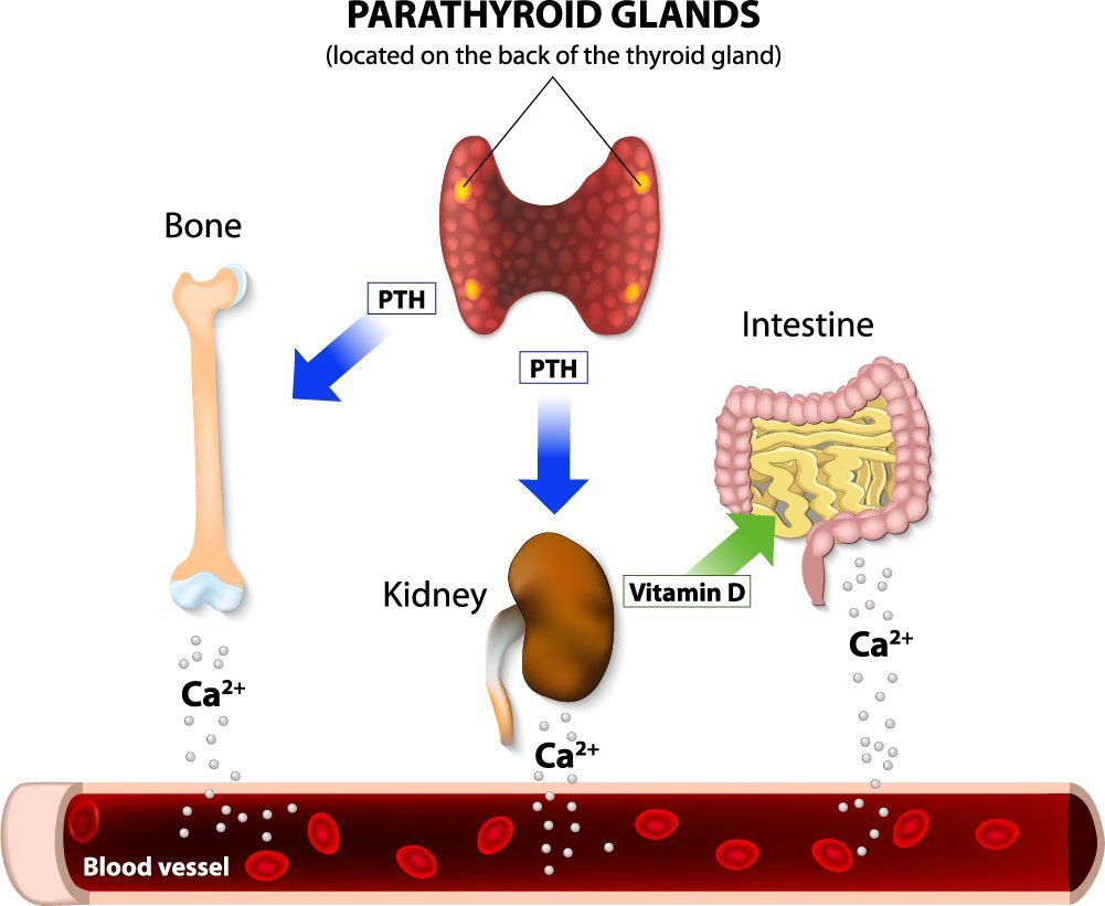 - Aktiverer D vitaminet som igjen absorberer calcium fra tarmen (påvirker mest total calcium i blodet)